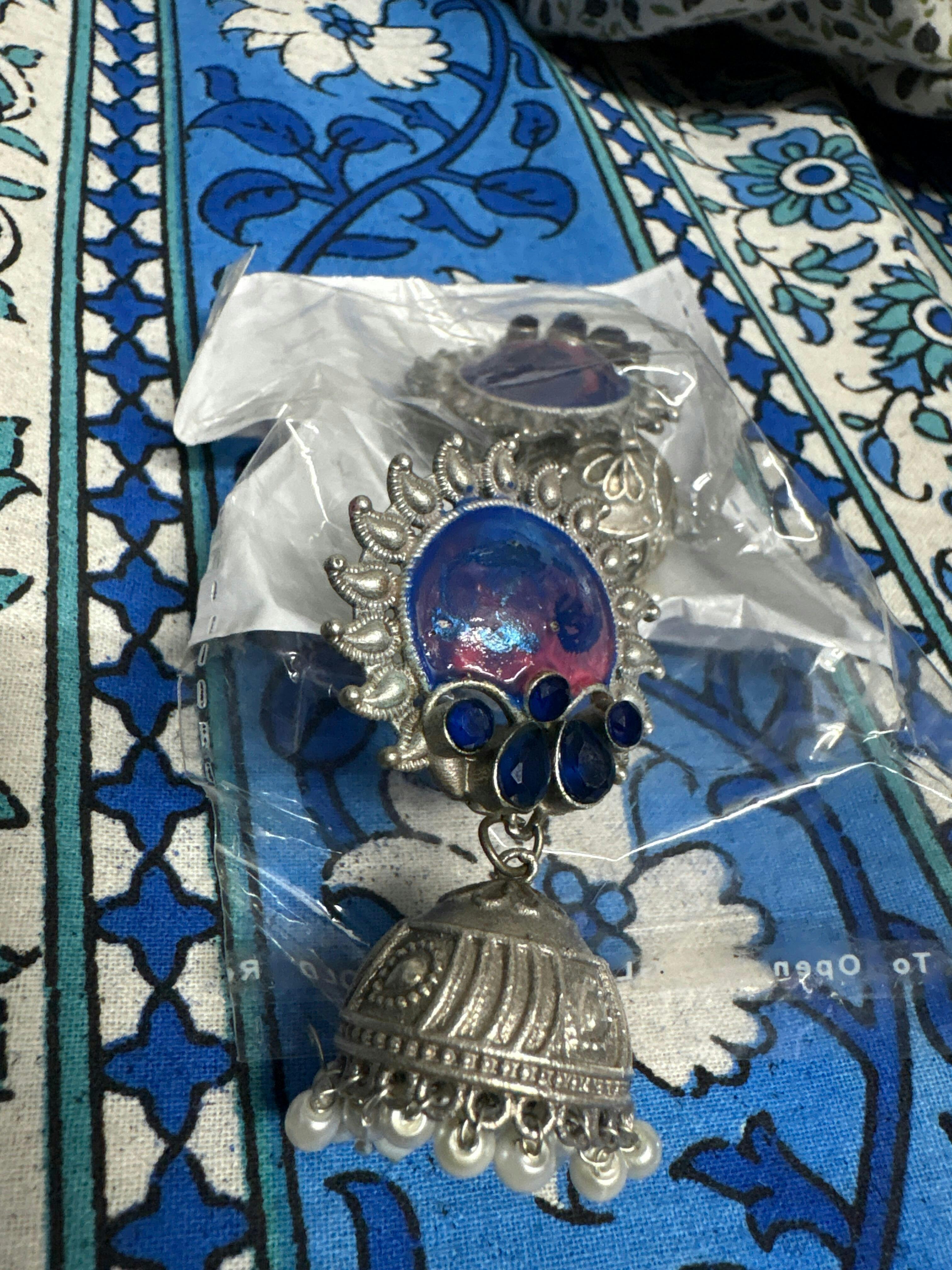 Elevate your ethnic look with our exquisite handcrafted silver jhumka earrings featuring a bold blue enamel centerpiece, adorned with royal blue gemstones and intricate oxidized dome-shaped jhumkas. Finished with delicate pearl drop detailing, these earrings blend traditional craftsmanship with a modern flair. Perfect for festive occasions, weddings, or elegant soirées, they pair beautifully with sarees, lehengas, or indo-western outfits. Add timeless charm to your jewelry collection with this versatile and artistic piece.